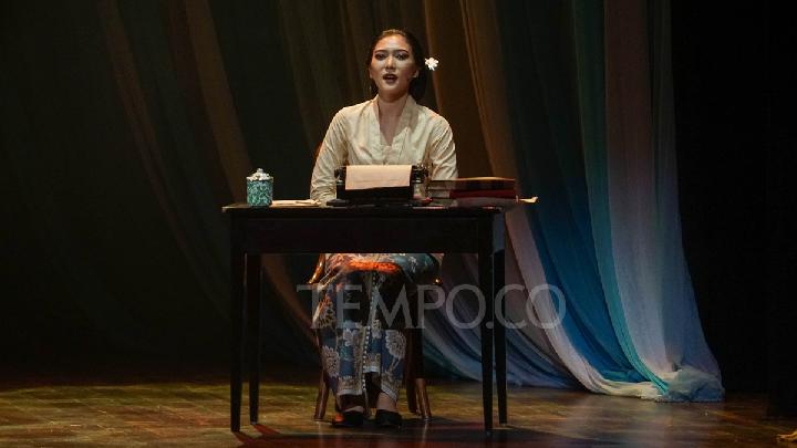 Aktris Isyana Sarasvati memerankan SK Trimurti dalam pementasan Monoplay Melati Pertiwi yang digelar di Gedung Kesenian Jakarta, Pasar Baru, Jakarta, 25 November 2025. Tempo/Ilham Balindra