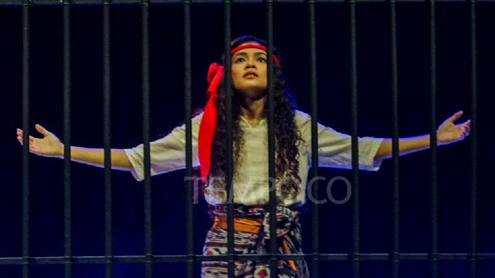 Aktris Glory Hillary memerankan Martha Cristina Tiahahu dalam pementasan Monoplay Melati Pertiwi yang digelar di Gedung Kesenian Jakarta, Pasar Baru, Jakarta, 25 November 2025. Tempo/Ilham Balindra