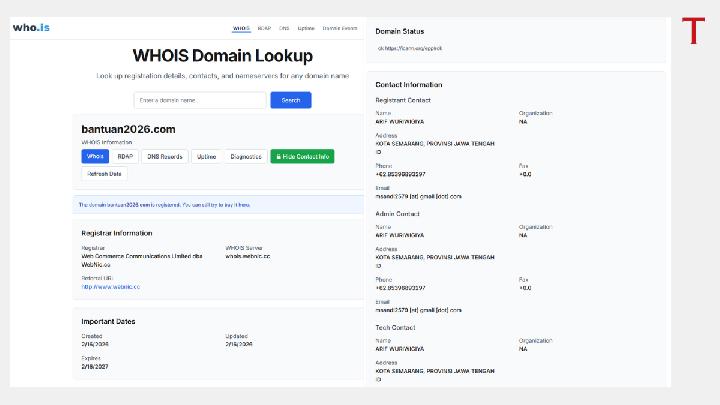 Furthermore, a domain search via who.is confirmed that the link does not belong to the Ministry of Social Affairs; instead, it is registered to a private individual. The owner is based in Central Java, and the website was created only one month ago.