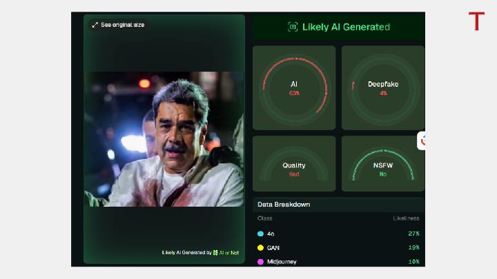 Analysis by the Deepfakes Analysis Unit (DAU) of the Trusted Information Alliance (TIA) in India indicates that the photo of Maduro in a white jacket with blood stains was artificially created. This conclusion was reached after the DAU analyzed it with two AI detection tools.