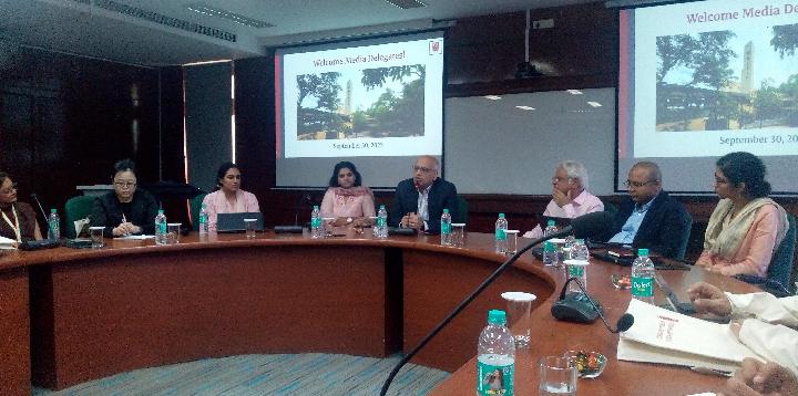 (Fourth from the left) Deepti Soni, Director of Communications and External Relations of the National Law School of India University (NLSIU) in Bangalore; Dr Nigam Nuggehalli, the Registrar of NLSIU Bangalore (center); and Dr. Saurabh Bhattacharje, Dean of Academics (Second from the right), they are explaining about the academics program of the university during the Familiarization Visit of Southeast Asian Journalists to India, on Tuesday, September 30, 2025. TEMPO/Petir Garda Bhwana